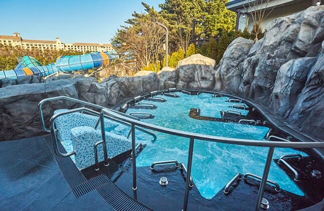 실외의 써니레이존에는 유수풀이 있어 몸을 맡긴 채 여유를 만끽할 수 있으며 절벽을 타고 떨어지는 폭포수와 25m 길이의 온천수영장도 물놀이하기 좋은 장소입니다. 토렌트리버존에는 음악을 콘셉트로 하고 있는 다양한 이벤트 탕이 있으며 급류 파도풀과 어린이들이 신나게 놀 수 있는 키즈 플레이존이 있어 어른과 아이 모두 신나게 물놀이를 즐길 수 있습니다.