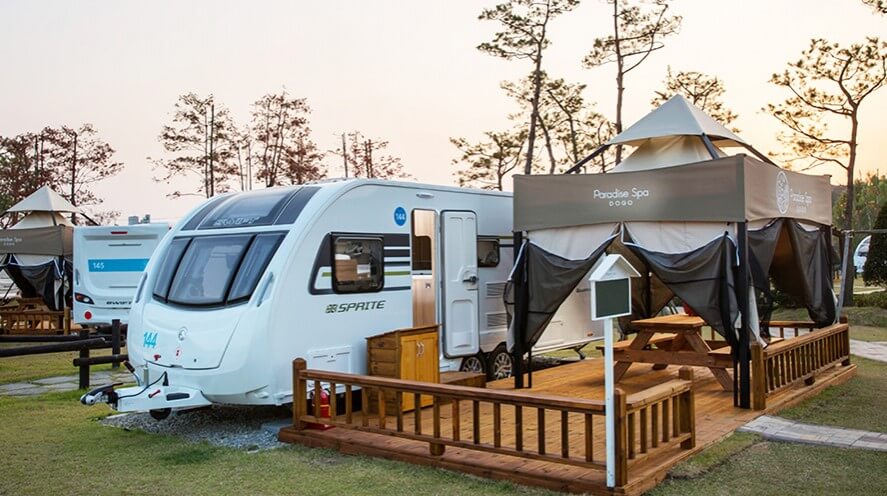 아산 파라다이스 스파 도고의 또 하나의 재미! 카라반 캠핑장도 빼놓을 수 없습니다. 온천 후 카라반에서의 하루는 아이들에게 또 다른 추억을 선사할 것입니다. 해 질 녘의 붉은 노을과 밤이면 쏟아지는 별들을 보며 그동안 못다 한 이야기를 나누고, 저녁 메뉴로 카라반에서 바비큐도 가능하다고 합니다. 바베큐 세트도 함께 판매하니 번거롭게 저녁 메뉴를 준비해갈 필요가 없습니다.
