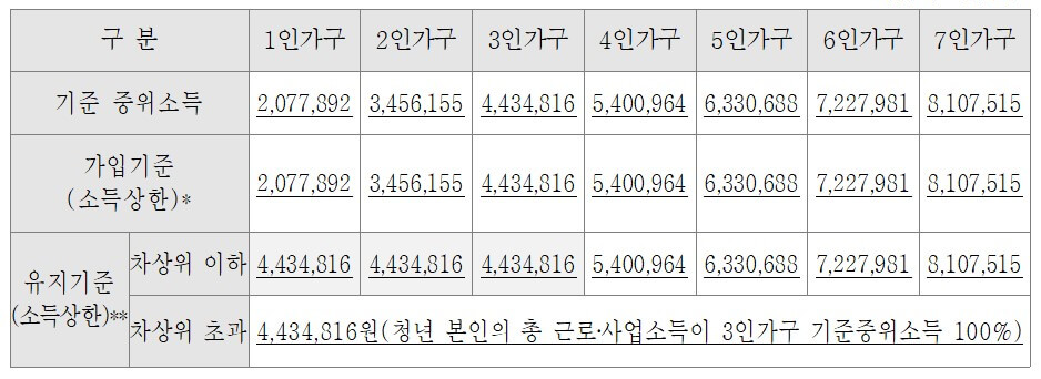 가입기준은 청년내일저축계좌 신청 당시 가구의 소득인정액이 기준중위소득 100% 이하가 되어야 합니다. 유지기준은 청년내일저축계좌에 가입되어 있는 동안 청년의 총 근로, 사업소득이 기준중위소득 100% 이하가 되어야 합니다.