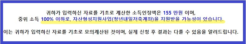 📢우리집 재산 및 소득을 계산해서 청년내일저축계좌 가입가능여부를 알려주는 계산기입니다. 모의계산기를 통해 간편하게 자격조건 및 가입가능여부 확인하시기 바랍니다.