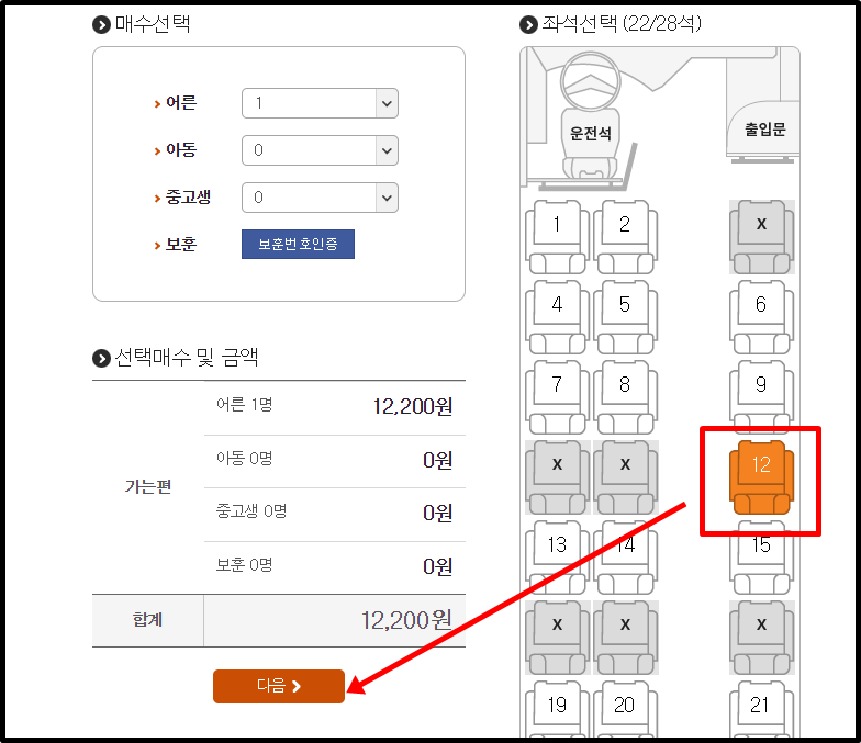 9. 원하는 자리를 선택 후 다음을 클릭합니다.