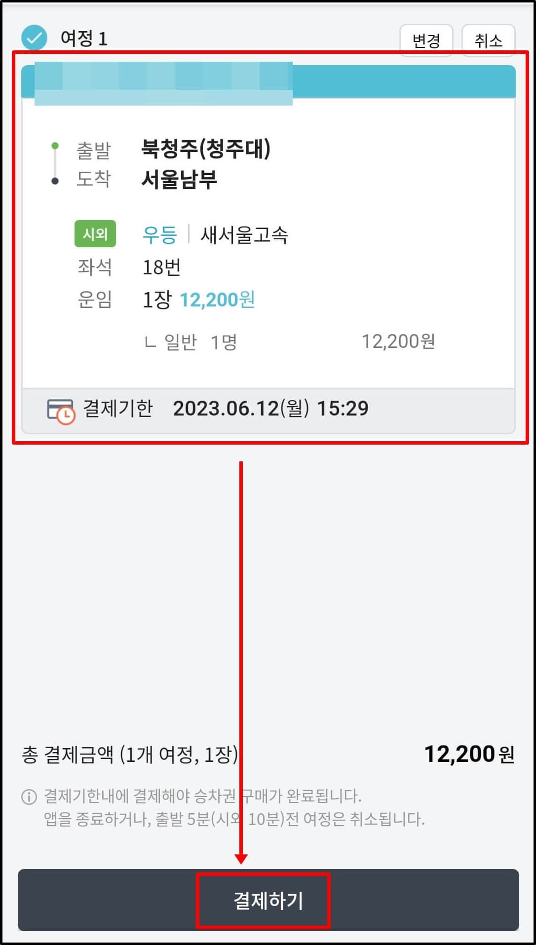 ※ 결제가 완료된 후에는 모바일 승차권이 저절로 발권되어 메인화면에 뜨게 됩니다. 모바일 발권이 된 경우에는 종이 승차권 발권 없이 QR코드로 바로 버스 탑승이 가능합니다.