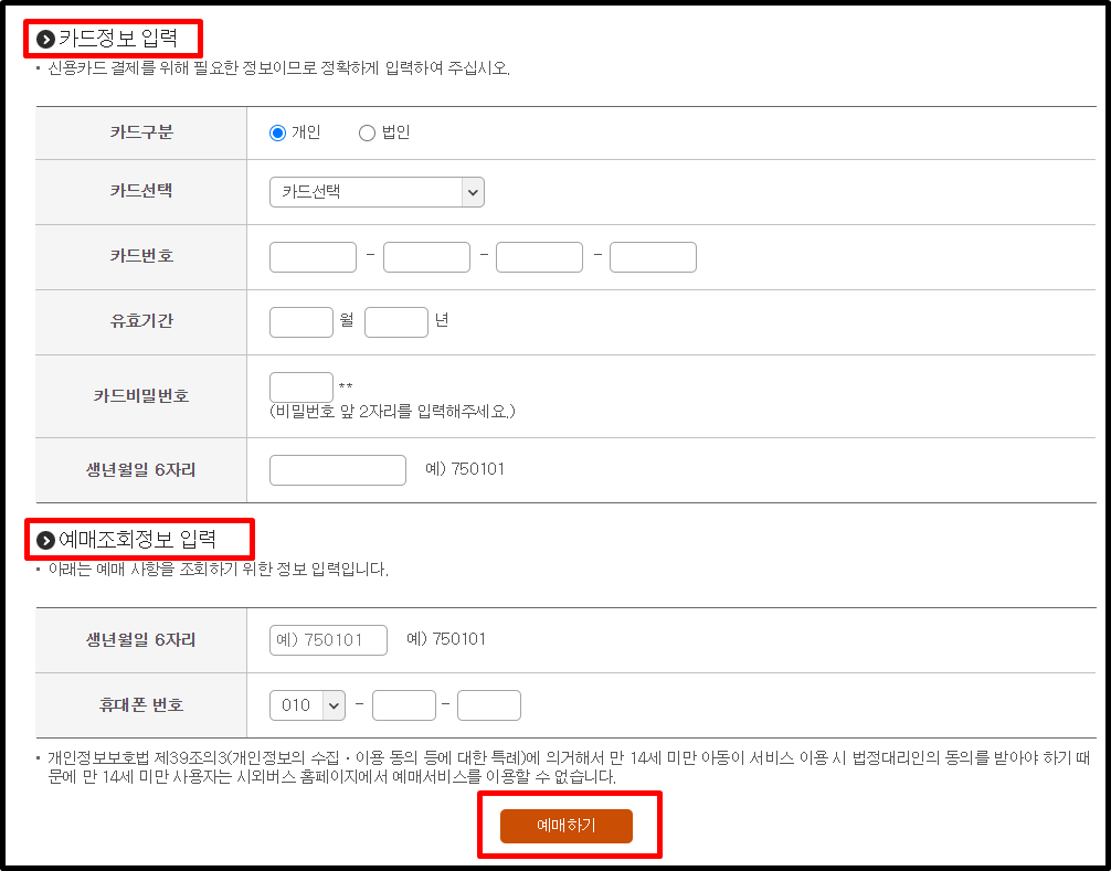 10. 카드정보와 예매조회정보를 입력 후 예매하기를 클릭하면 예매가 완료됩니다.