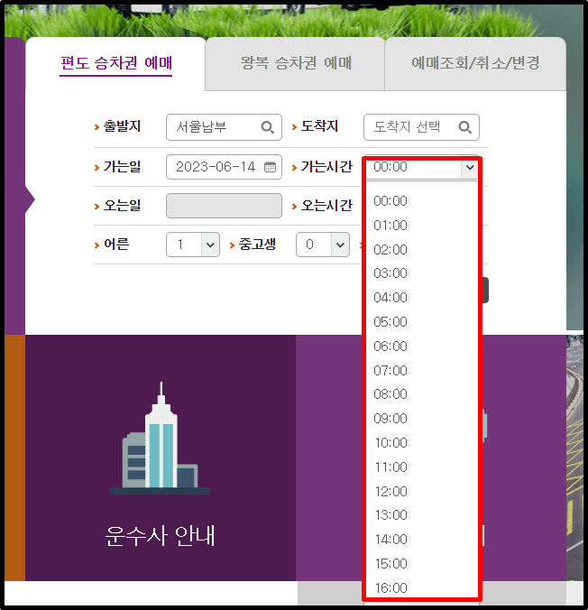 3. 출발 터미널을 검색 후 예매를 클릭합니다.