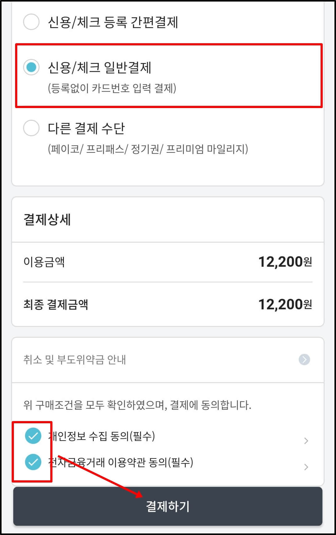 10. 신용/체크 일반결제 등 본인이 원하는 결제수단을 선택합니다.