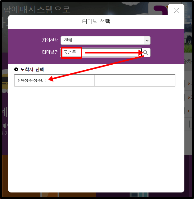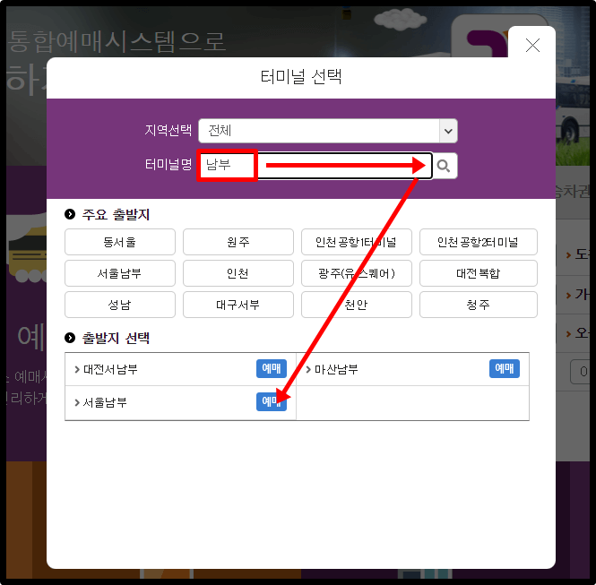 3. 출발 터미널을 검색합니다.