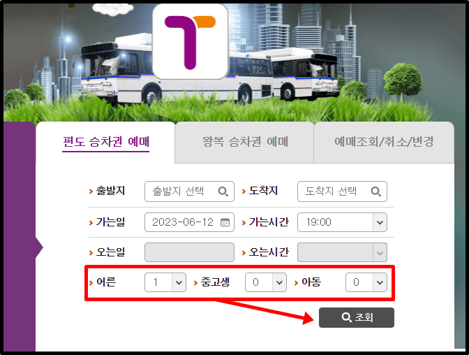 7. 탑승인원을 선택 후 조회를 클릭합니다.