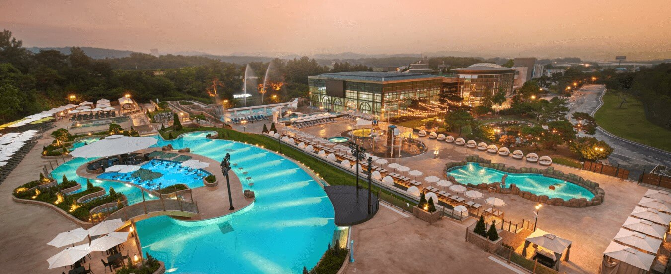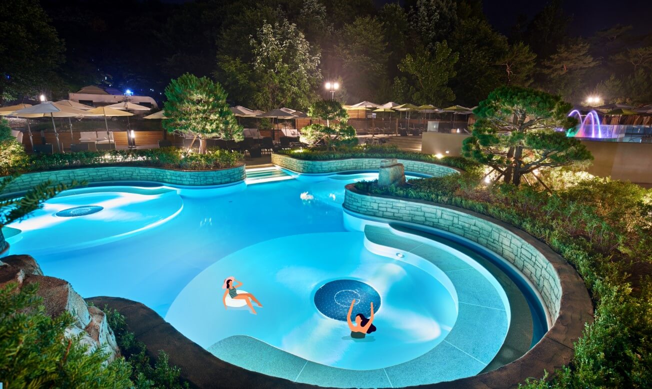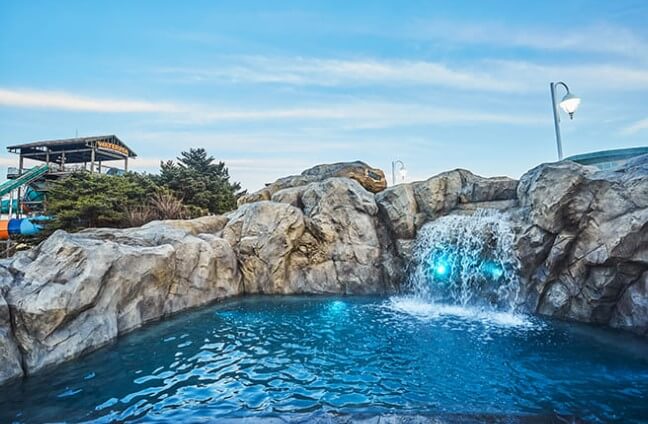 실외의 써니레이존에는 유수풀이 있어 몸을 맡긴 채 여유를 만끽할 수 있으며 절벽을 타고 떨어지는 폭포수와 25m 길이의 온천수영장도 물놀이하기 좋은 장소입니다. 토렌트리버존에는 음악을 콘셉트로 하고 있는 다양한 이벤트 탕이 있으며 급류 파도풀과 어린이들이 신나게 놀 수 있는 키즈 플레이존이 있어 어른과 아이 모두 신나게 물놀이를 즐길 수 있습니다.