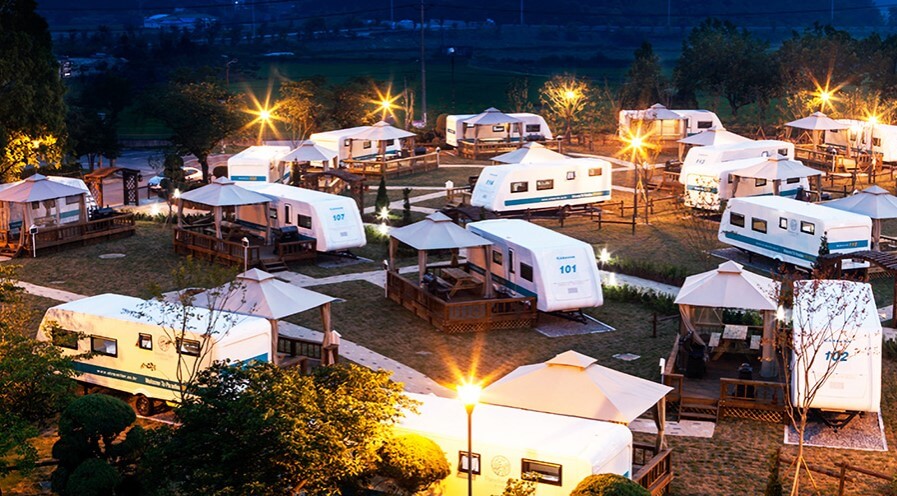 아산 파라다이스 스파 도고의 또 하나의 재미! 카라반 캠핑장도 빼놓을 수 없습니다. 온천 후 카라반에서의 하루는 아이들에게 또 다른 추억을 선사할 것입니다. 해 질 녘의 붉은 노을과 밤이면 쏟아지는 별들을 보며 그동안 못다 한 이야기를 나누고, 저녁 메뉴로 카라반에서 바비큐도 가능하다고 합니다. 바베큐 세트도 함께 판매하니 번거롭게 저녁 메뉴를 준비해갈 필요가 없습니다.