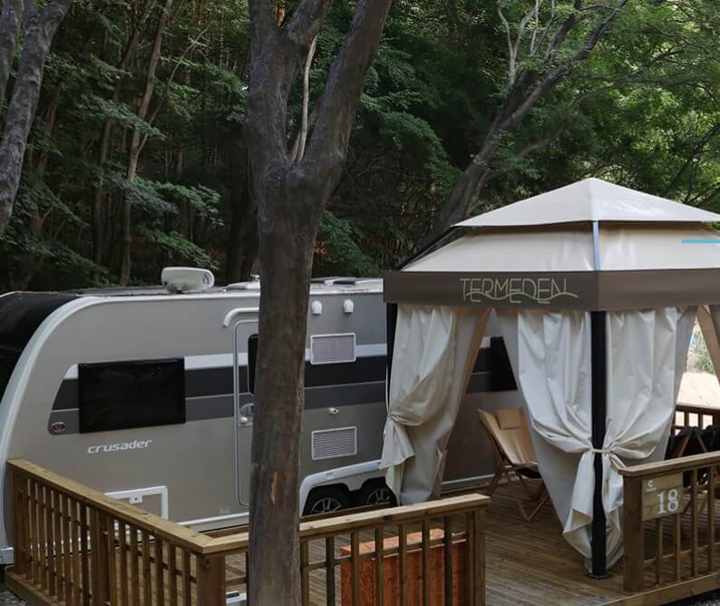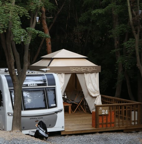 이천 테르메덴 풀앤스파 온천여행 장소에서도 카라반 캠핑과 한옥에서 숙박을 할 수 있습니다. 숲 속에서 카라반과 한옥에서의 휴식을 통해 피톤치드 삼림욕까지 한다면 최고의 겨울 휴양 여행이 되지 않을까요? 이곳에서는 바비큐 세트도 마련되어 있어 따로 먹을거리를 준비하지 않아도 됩니다. 카라반 투숙객은 풀&스파 또는 사우나 50% 할인된 금액으로 이용할 수 있습니다.