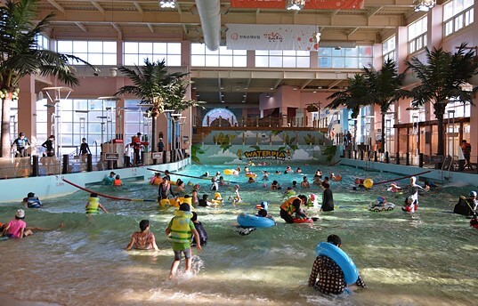 실외의 유수풀은 초당 1m 유속으로 물이 흐르며 길이는 150m로 각 코스별로 다양한 테마를 경험할 수 있습니다. 키즈랜드에는 어린이들이 안전하고 즐겁게 물놀이를 즐길 수 있도록 미끄럼틀, 컵분수 등 재미있는 시설들이 가득한 수중 놀이터가 있습니다. 또한 물놀이하면 빼놓을 수 없는 파도풀도 운영한다고 합니다. 추위를 잊은 아이들이 신나게 물놀이하는 모습이 저절로 떠오르네요.