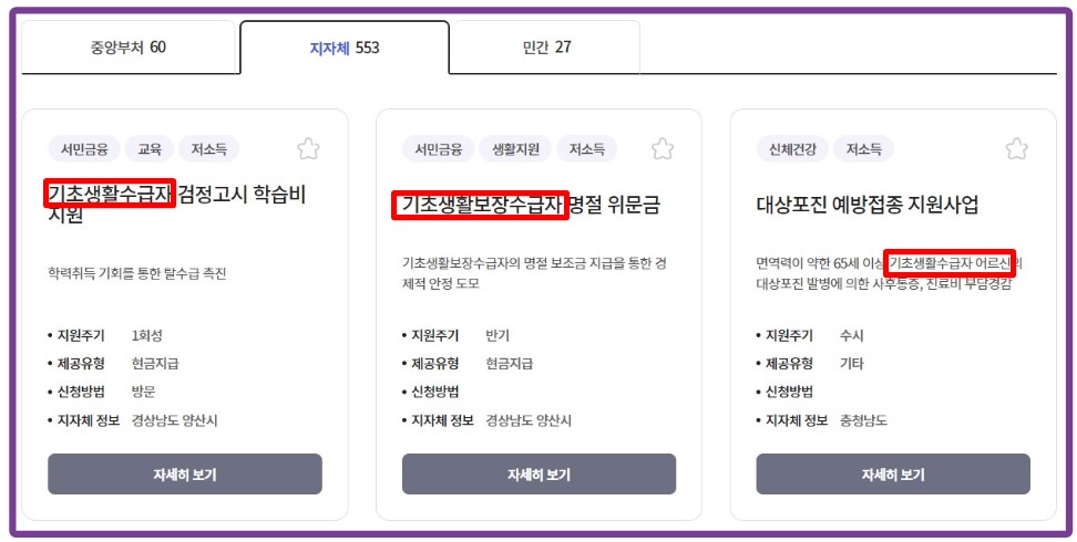 📢중앙정부, 지자체, 민간에서 주는 기초생활수급자 혜택을 한 번에 조회할 수 있습니다.
