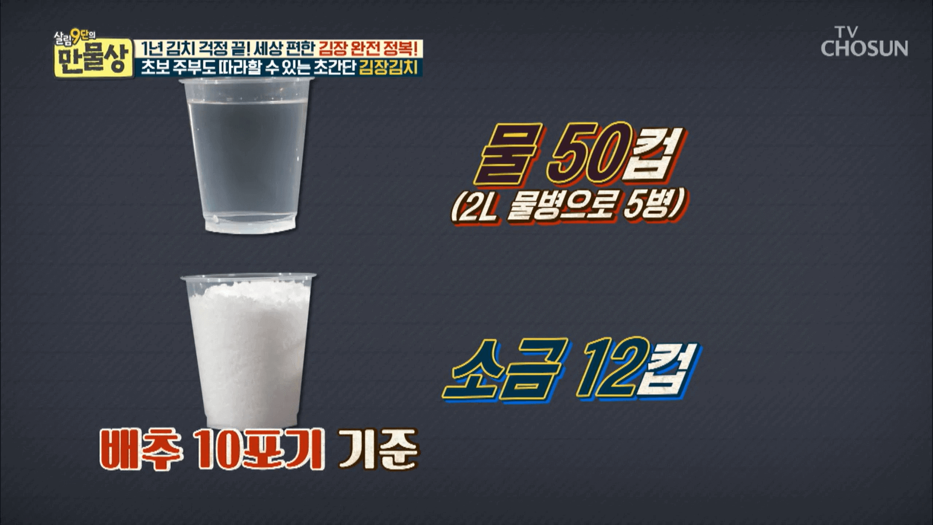 1. 물 50컵(2L 물병으로 5병)과 소금 12컵, 배추 10포기를 준비합니다.
