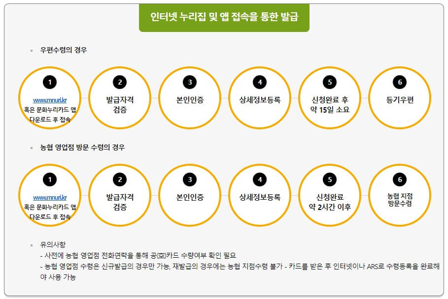 만약 온라인 신청이 어려운 분이라면 신분증을 가지고 주소지 주민센터에 방문하셔서 발급할 수도 있습니다. 온라인신청의 경우 등기우편으로 받을 시 15일 정도 소요되며 농협방문으로 신청시에는 약 2시간 이후 발급이 가능하지만, 주민센터에서 발급하는 경우 현장에서 바로 문화누리카드를 받을 수 있습니다.