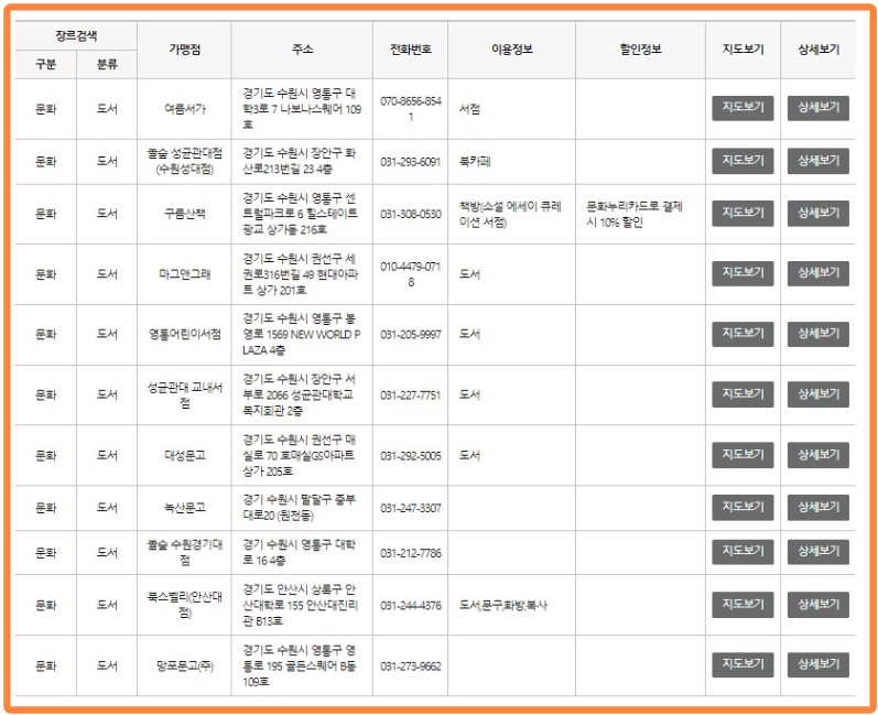 예를 들어 수원시를 조회해 보았는데요. 할인정보란에는 문화누리카드 이용 시 할인되는 내용이 있기도 하니 참고하시면 좋습니다. 지도 보기를 통해 해당 위치도 쉽게 볼 수 있습니다.