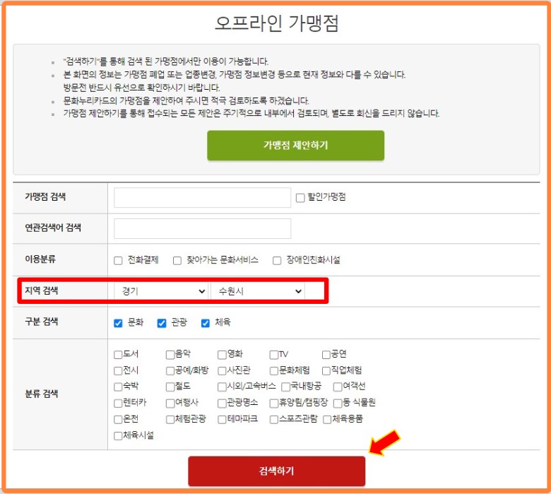 문화누리카드는 오프라인에서도 사용이 가능한데요. 위의 링크를 통해 내 주변 문화누리카드 사용처를 한 번에 조회할 수 있습니다. 지역검색란에 본인이 거주하는 도시를 입력 후 조회하면 문화누리카드 우리 동네 사용처를 볼 수 있습니다.
