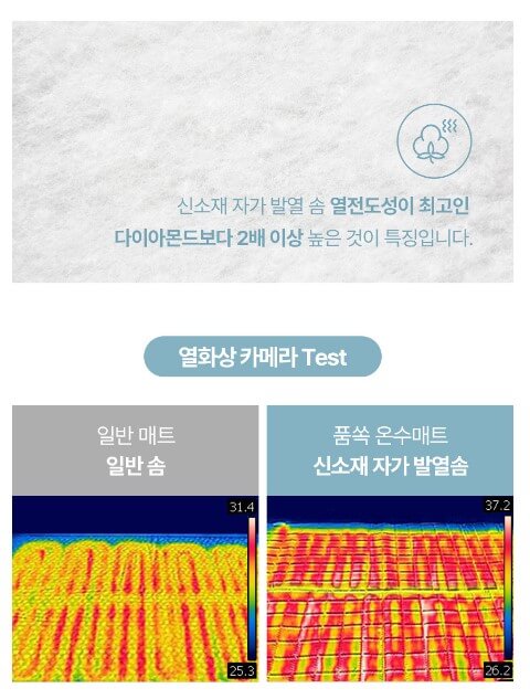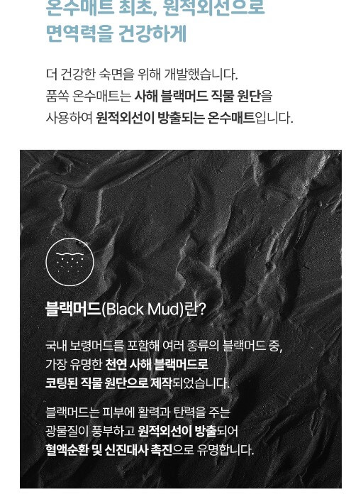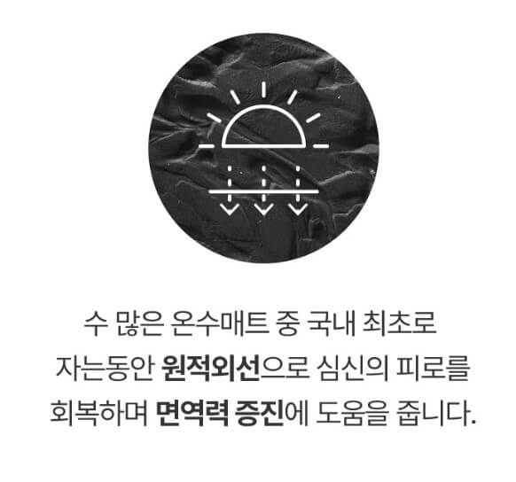 천연 사해 블랙 머드로 코팅된 직물로 제작되어 국내 최초로 원적외선이 방출되는 온수매트로 몸속까지 따뜻하게 해 줍니다.