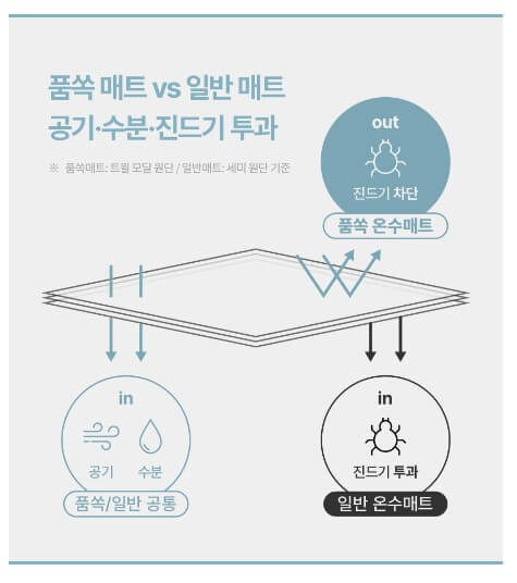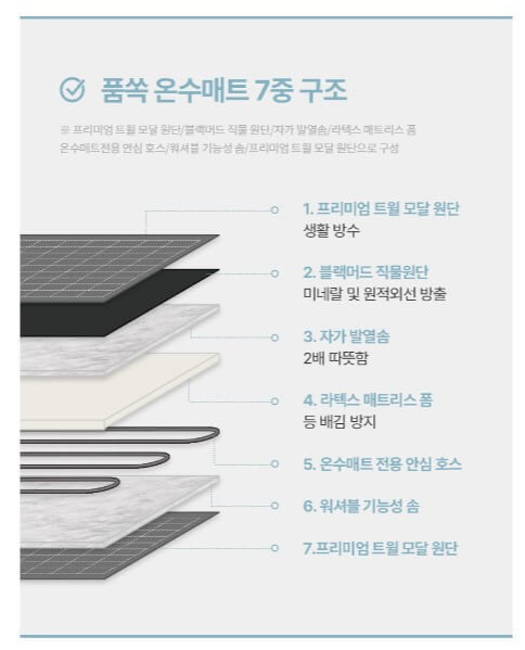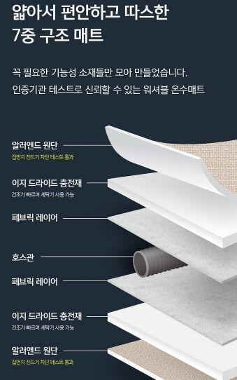 7중 구조 매트로 꼭 필요한 기능서 소재들만 모아 만들었으며 인증기관 테스트로 신뢰할 수 있는 워셔블 온수매트입니다. 알러 앤드 원단은 집먼지 기를 차단합니다.이지 드라이드 충전재가 들어 있어 통세탁이 가능합니다.