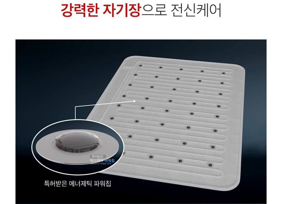 따뜻함과 개운함을 동시에 느낄 수 있는 신세계 경험이 가능한 온수매트인데요. 특허받은 에너제틱 파워칩 기술을 적용하여 40개의 에너제틱 파워칩에서 나오는 16,000 가우스의 강력한 자기장이 전신을 케어하는 구조입니다.