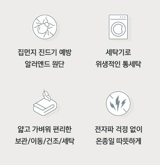 부드러움을 한층 높인 모달 원단은 신축성이 좋고 복원력도 우수하여 오래 사용 가능하며 세탁에도 뭉침, 변형이 거의 없으며 섬유질의 조직을 작게 하여 진드기의 서식을 막았습니다.