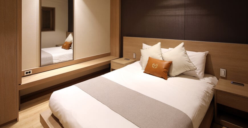 수안보온천 수호텔의 4인실 대중탕형과 5인실 대중탕형의 모습입니다. 4인실의 경우 온돌 형태이며, 5인실의 경우 더블침대1가 있습니다.