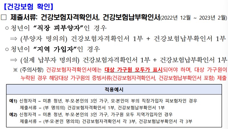 본인, 배우자, 자녀의 합계가 가구원수 및 소득확인범위가 됩니다. 22.12.~23.2. 건강보험 부과액/ 납입액으로 평가