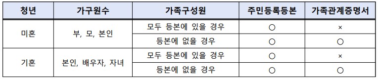 ✔️기혼청년인 경우 : 등본+가족관계증명서(배우자, 자녀가 다 등본에 나오면 생략가능)
