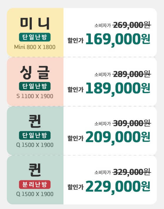 자연순환식 온수매트로 소비전력이 낮아 하루 8시간 작동 30일 기준으로 2,000원대의 전기세가 부과되어 경제적 부담 없이 쓸 수 있는 온수매트입니다. 사이즈는 미니부터 퀸사이즈까지 다양하게 있습니다. 가격도 함께 확인하세요!