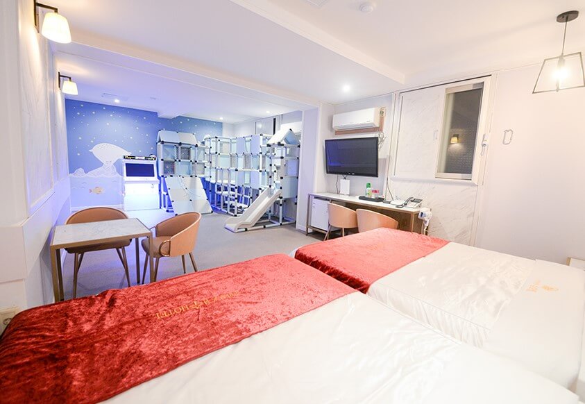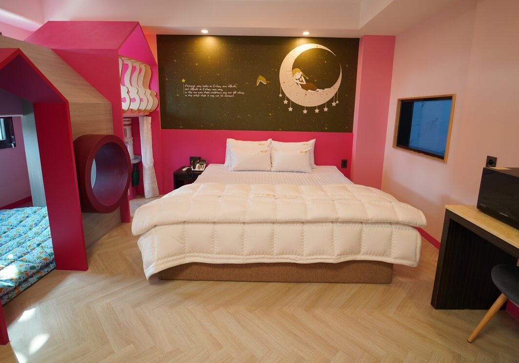 2019년에 오픈한 부곡온천 키즈스테이 호텔은 시설이 깨끗하고 아이들의 상상력을 자극하는 다양한 공간으로 꾸며져 있습니다. 호텔 내에는 가족탕은 기본이고, 레이싱룸, 인디안룸, 글램핑룸, 핑크룸, 플레이룸, 캐리비아룸 등의 테마에 맞게 알록달록 이쁘게 구성되어 있습니다.