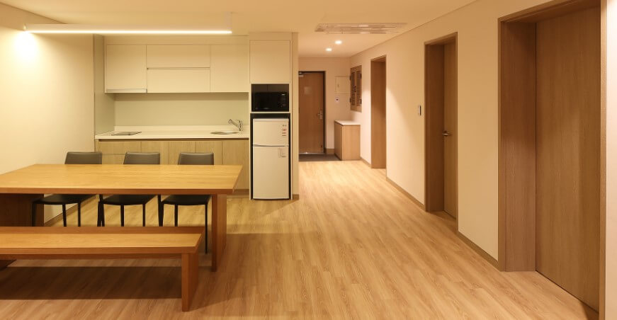 수안보온천 수호텔의 4인실 대중탕형과 5인실 대중탕형의 모습입니다. 4인실의 경우 온돌 형태이며, 5인실의 경우 더블침대1가 있습니다.